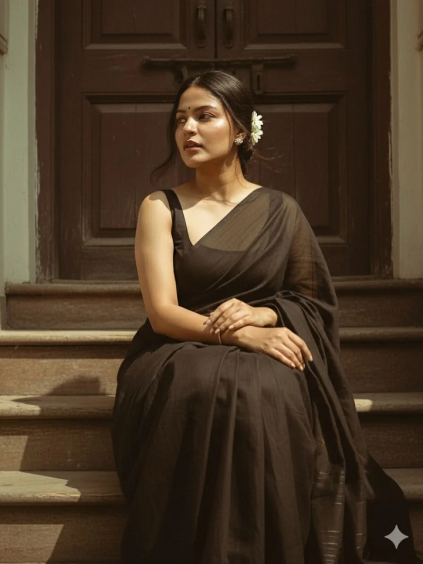 Create a retro, vintage inspired image -grainy yet bright - based on the reference picture. The girl should be draped in a perfect grey black cotton saree with sleeveless blouse, Pinterest-style aesthetic saree. The vibe must capture the essence of a 90s movie and innocence with dark brown open haired baddie, with silky hair and a small flower tucked visibly into her hair, enhanced by a windy, romantic atmosphere. She sits on stairs infront of a old wooden door, her eyes so deep and intriguing looking left towards us as if she's eagerly waiting for her love, where deep shadows and dramatic contrasts add mystery and artistry to the scene, creating a moody yet enchanting cinematic effect. Make a pose like she is adjusting her saree.