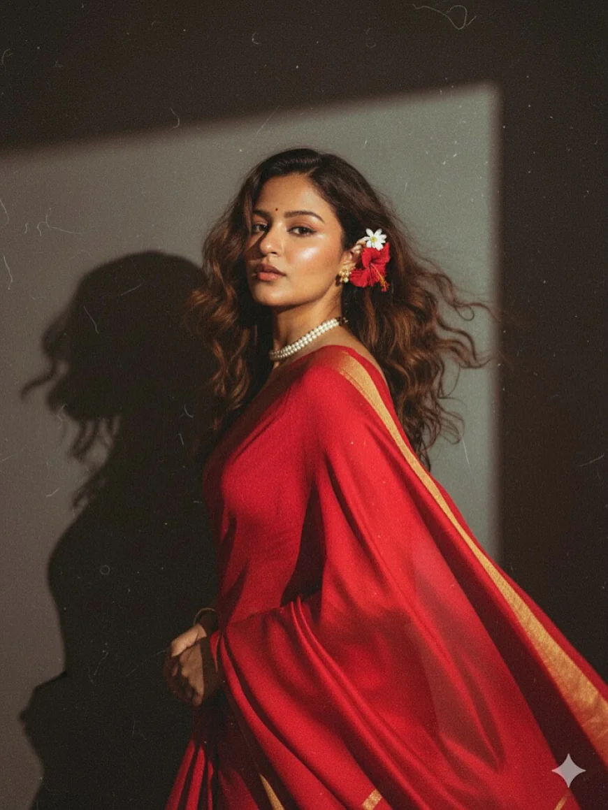 Create a retro, vintage-inspired image -grainy yet bright - based on the reference picture. The girl should be draped in a perfect red, Pinterest-style aesthetic retro saree. The vibe must capture the essence of a 90s movie black haired baddie, with open hair and slight wavy curls mostly straight and a small flower tucked visibly into her hair, enhanced by a windy, romantic atmosphere. She stands against a solid wall, where deep shadows and dramatic contrasts add mystery and artistry to the scene, creating a moody yet enchanting cinematic effect.