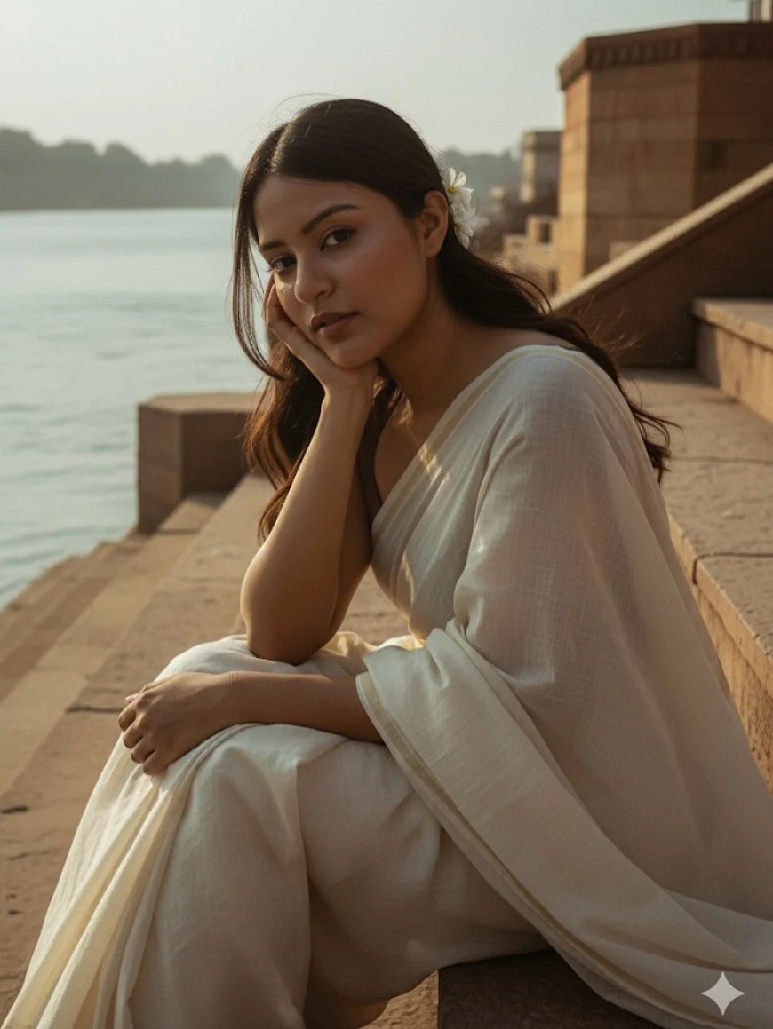 Create a retro, vintage inspired image -grainy yet bright - based on the reference picture. The girl should be draped in a perfect cotton saree with sleeveless blouse contrasting her beauty, Pinterest-style aesthetic saree. The vibe must capture the essence of a 90s movie innocence andher dark brown haired baddie, with silky hair and a small flower tucked visibly into her hair, enhanced by a windy, romantic atmosphere. She is sitting on stairs of ganga ghat with river flowing and she's looking left towards the camera, where on one hand she rests her face with soothing intrigued eyes looking at the camera. where deep shadows and dramatic contrasts add mystery and artistry to the scene, creating a moody yet enchanting cinematic effect.