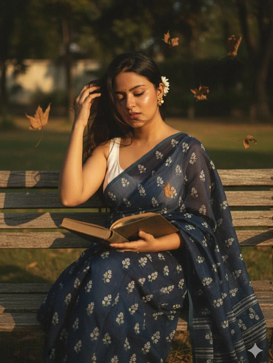 Create a retro, vintage-inspired image - grainy yet bright - based on the reference picture.The girl should be draped in a perfect dark blue cotton saree with small white flower prints, paired with a white sleeveless blouse, styled in a Pinterest-inspired aesthetic. The vibe must capture the essence of a 90s movie and innocence dark-brown-haired baddie with open hair, with silky hair and a small flower tucked visibly into her hair, enhanced by a windy as if wind disturbing her hair, romantic atmosphere. She is siting on a wooden bench in a garden as a few leaves blow in the air, while dramatic contrasts add mystery and artistry to the scene, creating a moody yet enchanting cinematic effect. Her pose should suggest that she is reading a book with lots of grace, one hand holding book and the other trying to manage Hair on face due to windy atmosphere.