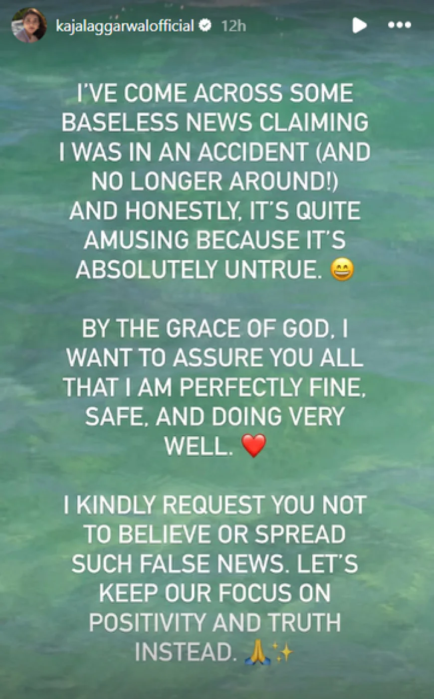 In a post on her official Instagram Story, Kajal wrote, "I've come across some baseless reports claiming that I was in an accident (and am no longer in this world), and honestly, it's quite amusing because it's completely untrue."
